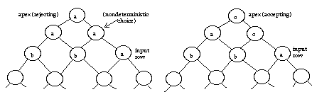 The diagram below shows two computations for the input "bba". The computation on the left rejects the input since the state of the apex is "a"; but the computation on the right accepts the input since the state of the apex is "c". Since some computation results in an accepting state for the apex, the input "bba" is accepted by the NTA. The input "bbb" would be rejected by this NTA since the only computation results in the state "a" for the apex.
