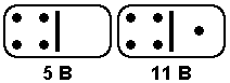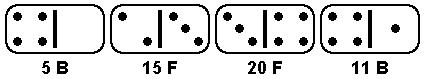 The original draw resulted in these six dominoes. Note that when each domino is aligned, it may appear in either its forward or its backward orientation (the table above shows the forward orientations of all non-doubles). Play begins from the left end and returns to the left end after any pair of dominoes is eliminated. In this case, domino #12 (in its forward orientation) and domino #17 (in its backward orientation) are eliminated from the row since they touch each other with 5 pips. The row is collapsed and play begins again at the left end. This time, dominoes #15 and #20 (both in their forward orientations) are eliminated since they touch each other with 3 pips. The row is again collapsed. Since no further eliminations can be made, the game ends. Note that dominoes #20 and #11 could not be eliminated since they were never the left-most pair.