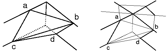 "Just use two planes, one determined by a, b, and c, and the other determined by b, and c, and d."