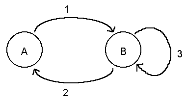 There are two states in this FSM, labeled A and B, and three transitions, labeled 1, 2, and 3. If the current state is A, and the conditions for transition 1 are met, then the current state becomes B. When the current state is B, and the conditions for transition 2 are met, the current states becomes A again. If the current state is B and the conditions for transition 3 are met, the current state remains B.