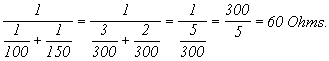 Connecting three resistors in parallel uses the same rule, so a 100 Ohm, 150 Ohm, and 300 Ohm resistor in parallel would yield a combined resistance of just 50 Ohmsthat is, 1/(1/100+1/150+1/300) Ohms.