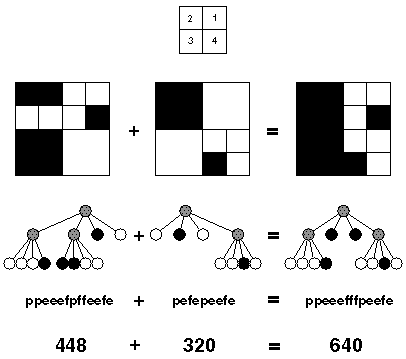 In the figure, the first example is shown (from top to bottom) as image, quadtree, pre-order string (defined below) and number of pixels. The quadrant numbering is shown at the top of the figure.