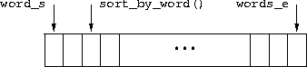 static sort_node * sort_by_words( sort_node * words_s, sort_node *& words_e) // Compress nulls. for snp = words_e - 1; words_s <= snp; --snp if (not snp->word) *snp = *--words_e; // Sort by word. for snp = words_s; snp < words_e; snp++ min = snp for j = snp + 1; j < words_e; j++ if min->word->word > j->word->word min = j swap(snp, min) // Find leftmost run. for snp = words_s; snp < words_e; snp++ if snp->word->word != words_s->word->word break sort_by_count(words_s, snp) return snp