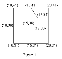 3. Boundary line segments in the input file do not extend past corners of lots. For example, in Figure 1 the surveyor must survey from the point (10,41) to (15,41) and from (15,41) to (20,41) rather than surveying the entire line (10,41) to (20,41).