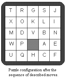Format each line for a final configuration so that there is a single blank character between two adjacent letters. Treat the empty square the same as a letter. For example, if the blank is an interior position, then it will appear as a sequence of 3 blanks--one to separate it from the square to the left, one for the empty position itself, and one to separate it from the square to the right.