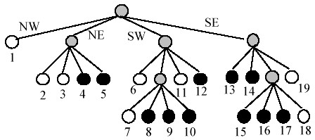 A tree can be represented by a sequence of numbers representing the root-to-leaf paths of black nodes. Each path is a base five number constructed by labeling branches with 1, 2, 3, or 4 with NW = 1, NE = 2, SW = 3, SE = 4, and with the least significant digit of the base five number corresponding to the branch from the root. For example, the node labeled 4 has path NE, SW which is 325 (base 5) or 1710 (base 10); the node labeled 12 has path SW, SE or 435 = 2310; and the node labeled 15 has path SE, SW, NW or 1345 = 4410. The entire tree is represented by the sequence of numbers (in base 10)