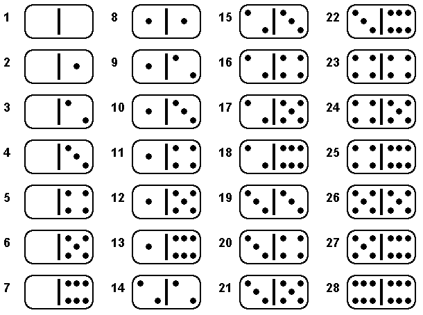 Consider a standard set of double-six dominoes with each piece in the set (each bone) assigned an identification number as shown below: