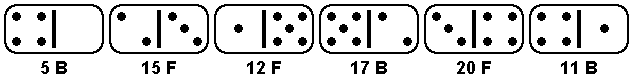 The original draw resulted in these six dominoes. Note that when each domino is aligned, it may appear in either its forward or its backward orientation (the table above shows the forward orientations of all non-doubles). Play begins from the left end and returns to the left end after any pair of dominoes is eliminated. In this case, domino #12 (in its forward orientation) and domino #17 (in its backward orientation) are eliminated from the row since they touch each other with 5 pips. The row is collapsed and play begins again at the left end. This time, dominoes #15 and #20 (both in their forward orientations) are eliminated since they touch each other with 3 pips. The row is again collapsed. Since no further eliminations can be made, the game ends. Note that dominoes #20 and #11 could not be eliminated since they were never the left-most pair.