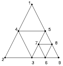Mel always starts at the top of the top triangle, drawing a line straight to the lower-left corner of the lower left triangle (in this example, 1-2), continuing with a line to the lower-right corner of that triangle (in this example, 2-3). Next, he works his way up by drawing a line to the top of that triangle (in this example, 3-4). Now he has either reached the starting point again (finishing yet another masterpiece) or he has reached the lower-left corner of another triangle (in this example, 1-4-5). In the latter case, he continues by drawing the bottom line of that triangle (4-5) and after that he starts working on the triangle or triangles that is or are located underneath the lower-right corner of that triangle, in the same way. So he continues with (5-3), (3-6), (6-7), (7-8), (8-6), (6-9), and (9-1) as the finishing touch.