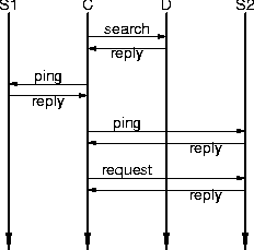 shows a client C searching for some resource and receiving from D the reply that Suppliers S1 and S2 have the resource. C pings both suppliers and decides that S2 is faster, and makes its resource request to S2.