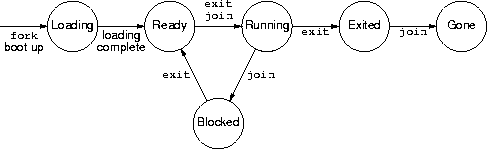 Fork-join synchronization requires that one process (the joining process) block until another process executes (the joined process). Once the joined process exits, the joining process unblocks.