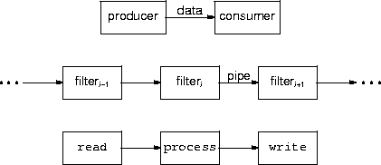 procedure read(queue q) while !eof q.put(read()) q.put(stop) procedure work (queue in, queue out) while true x = in.get() if x == stop, break out.put(f(x)) out.put(stop) procedure write(queue q) while true x = q.get() if x == stop, break write(x) procedure main() queue read2work, work2write co read(read2work) || work(read2work, work2write) || write(work2write) oc