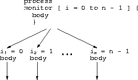 Declarationprocess monitor [ i = 1 to n ] { while (true) { whatever } }