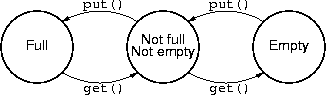class BQ private Object q[] private int size boolean empty() return size == 0 boolean full() return size == q.len boolean put(o) // put o in q return size == 1 boolean get(o) // take o from q. return size == q.len - 1 |