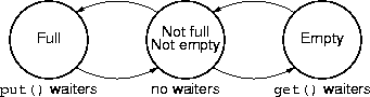 class BoundedQueue private final Object q[] private int size synchronized Object get() while (size == 0) wait() // take o from queue. notifyAll(); return o synchronized void put(Object o) while (size == q.length) wait() // put o on queue. notifyAll();